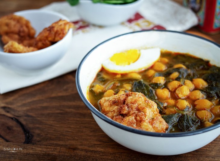 Potaje de garbanzos con espinacas y bocaditos de pan de ajo